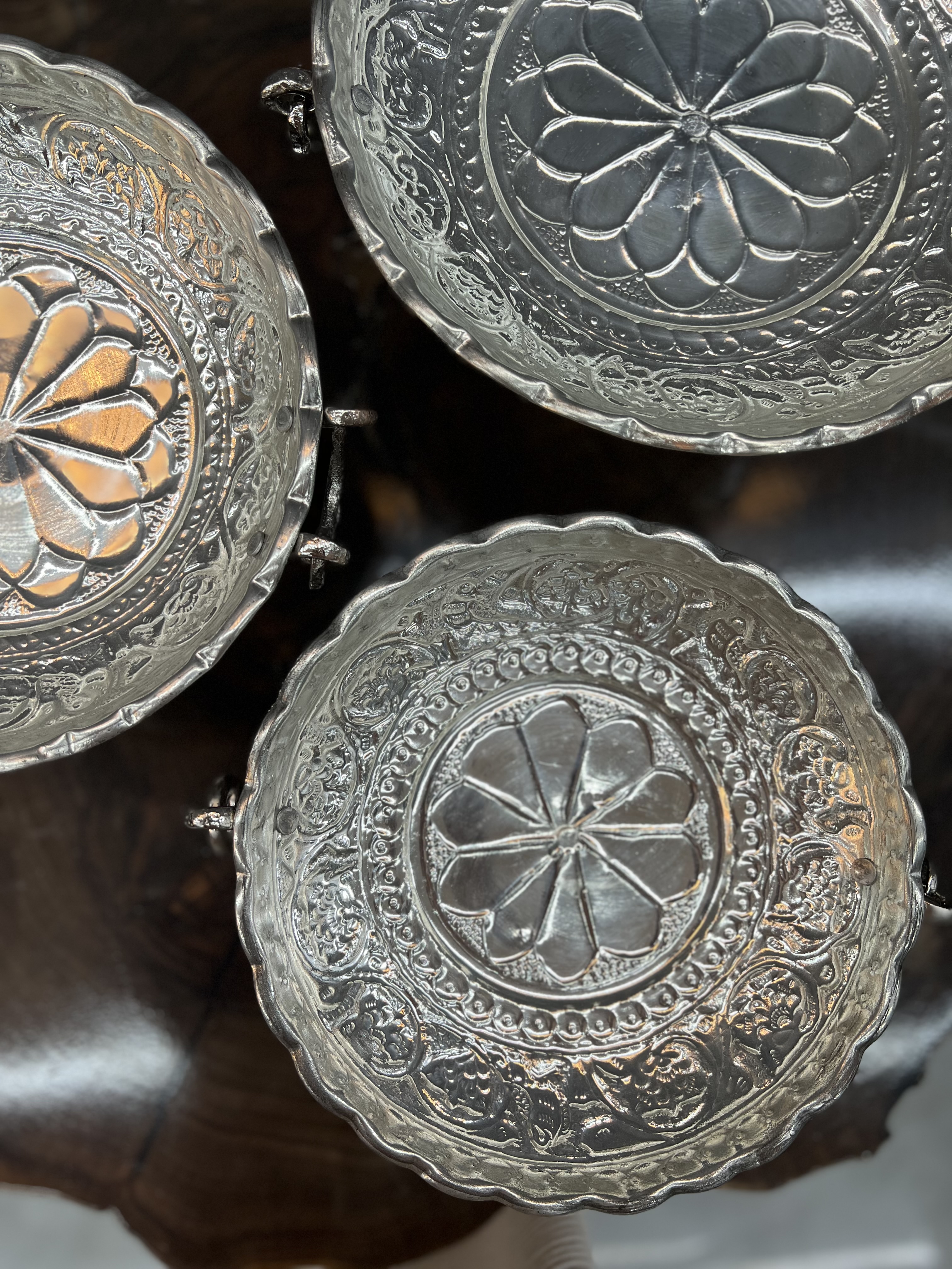 ظروف مسی سیاه قلم دورو سفید ترکیبی منحصر به فرد از هنر سنتی و طراحی مدرن هستند. این ظروف با استفاده از تکنیک سیاه قلم بر روی مس ساخته شدهاند و سطح آنها با رنگ سفید تزئین میشود که جلوهای شیک و زیبا به آنها میبخشد. ظروف مسی سیاه قلم علاوه بر جنبه زیبایی، خاصیت ضدباکتری دارند و برای استفاده در مراسمات خاص و تزئینات داخلی منزل بسیار مناسب هستند